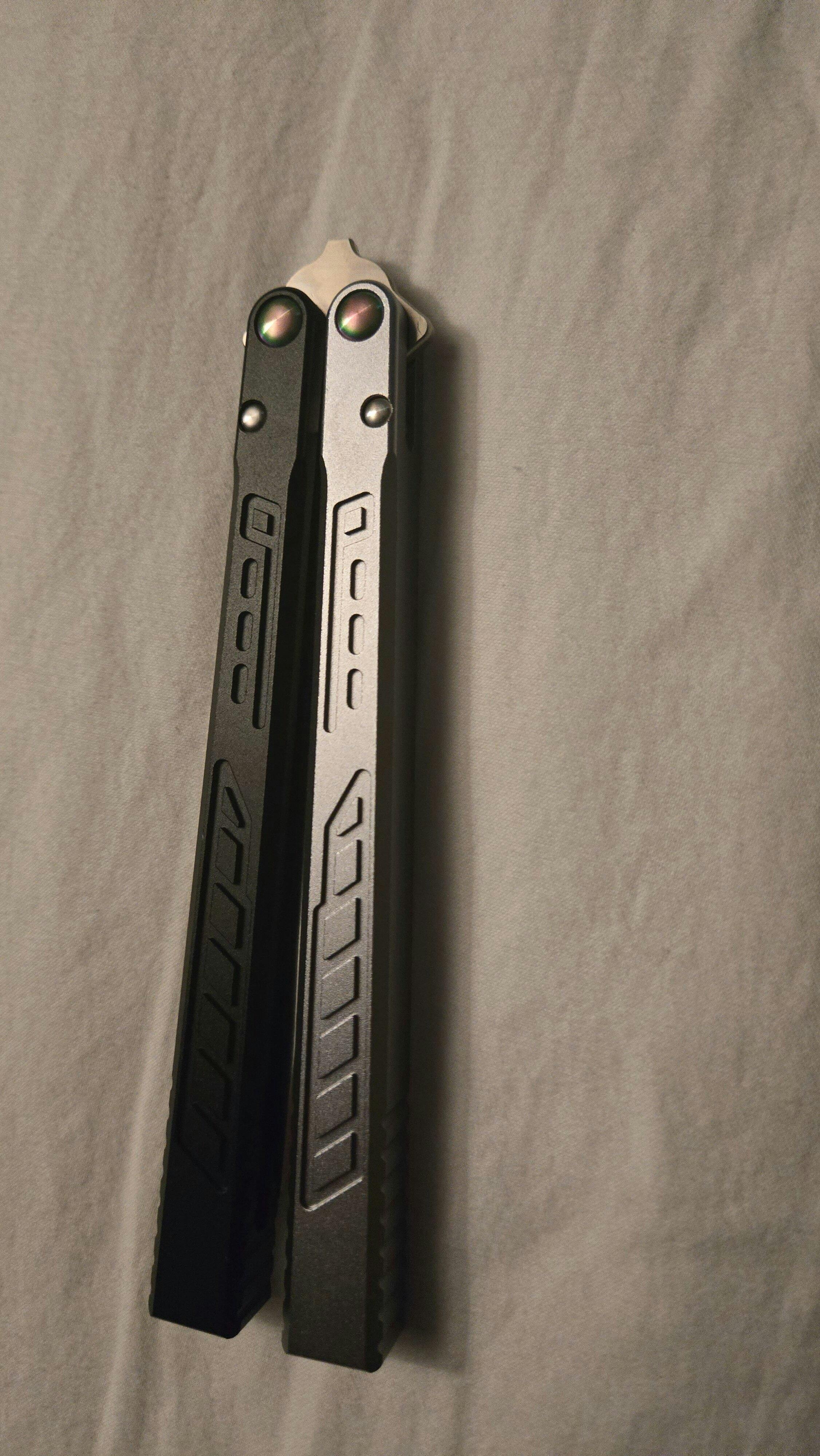 The ONE "falcon" balisong ORIGINAL DESIGN aluminum Butterfly Knife w/ BUSHINGS sharp 440C or Trainer, with either Blue, Silver, Purple or Black channel construction, and Zen Pin system. Finally an affordable, flipable Balisong the community can be proud of, now IN STOCK. Featured as one of S2G's highest quality butterfly knives.