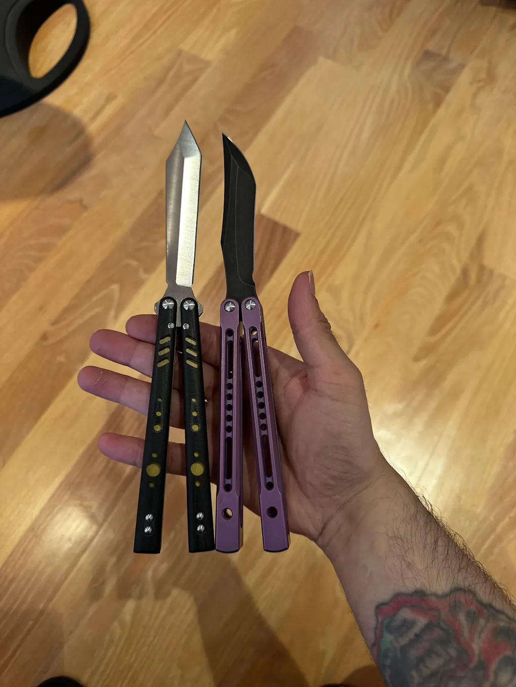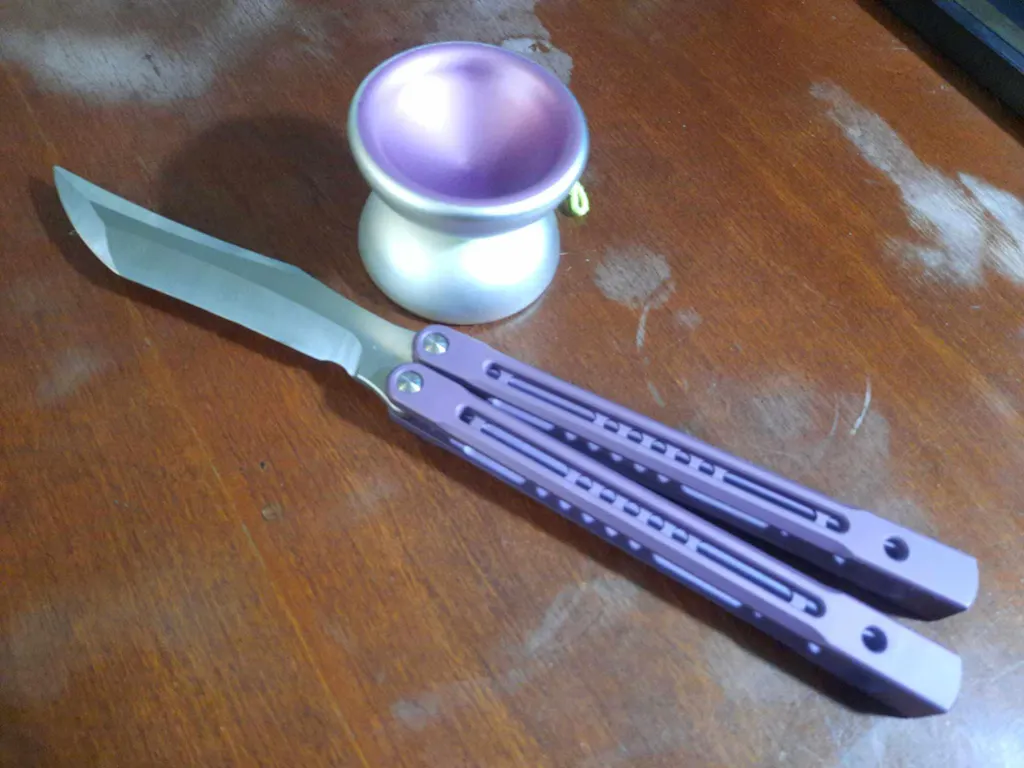 The ONE TITANIUM balisong known as the MONARCH (clone) Butterfly Knife w/ BUSHINGS D2 Sharp/Live Blade or Trainer. With either Grey, Blue, Black, Purple or Green Anodized channel construction. NO zen or tang pins (unique design) and Latchless.